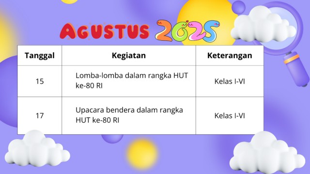Tanggal Kegiatan Keterangan Lomba-lomba dalam rangka HUT 15 Kelas I-VI ke-80 RI Upacara bendera dalam rangka 17 Kelas I-VI HUT ke-80 RI
