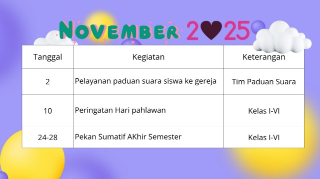 Tanggal Kegiatan Keterangan 2 Pelayanan paduan suara siswa ke gereja Tim Paduan Suara 10 Peringatan Hari pahlawan Kelas I-VI 24-28 Pekan Sumatif AKhir Semester Kelas I-VI