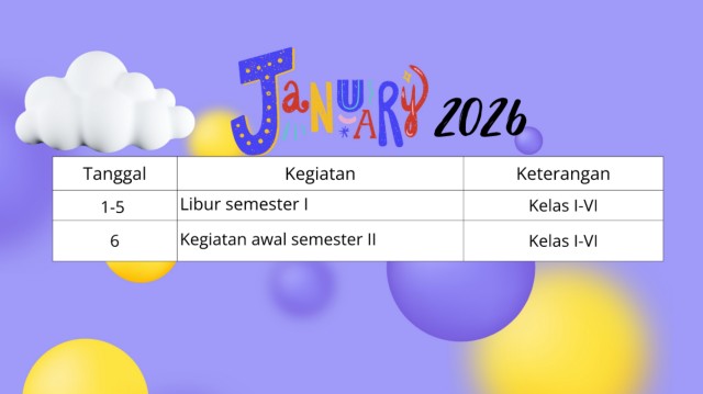 2026 Tanggal Kegiatan Keterangan 1-5 Libur semester I Kelas I-VI 6 Kegiatan awal semester II Kelas I-VI